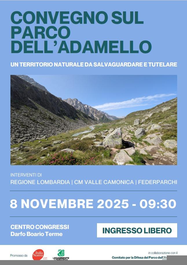 Segnaliamo ai nostri lettori che il giorno Sabato 8 Novembre, alle ore 09:30, presso il Centro Congressi di Darfo Boario Terme in Via Romolo Galassi 30 (qui link a google maps) si terrà un convegno sul Parco dell’Adamello promosso da Italia Nostra e Legambiente in collaborazione con il Comitato per la difesa del Parco dell’Adamello.